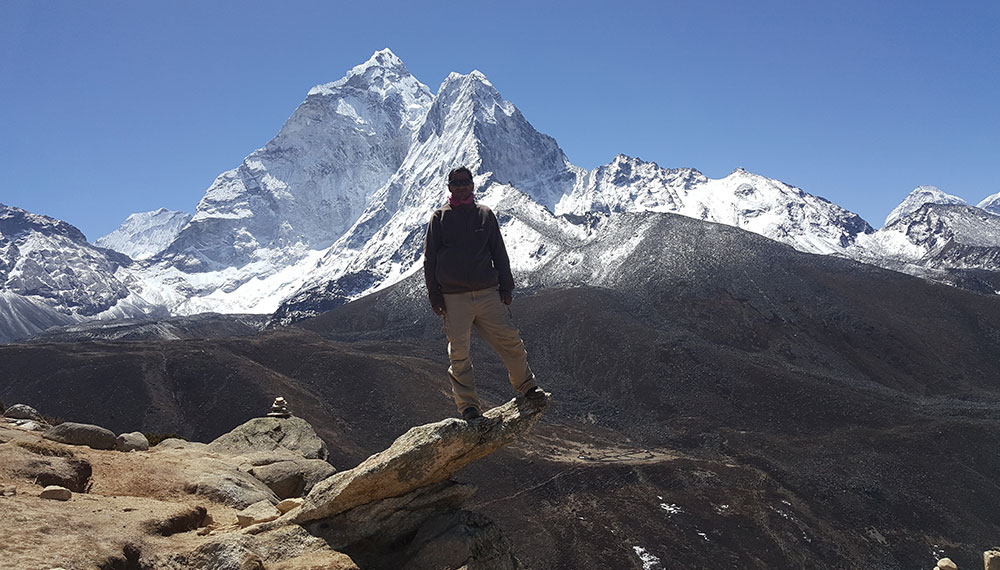 To acclimatise: head north to the Nangkartshang Hill ridge (4 800m) for views of the Nuptse Glacier, Chhukhung Ri (4 230m, which masks Lhotse’s glaciers) and Imja Tse (6 189m). Further east, along the Mahalangur Himal Ridge, is imposing Makalu (8 463m). Towards the south is, Amphu Lapcha’s fluted ridge (5 845m) and the unusual view of Ama Dablam’s north face and glaciers. Return to the Summit Lodge.