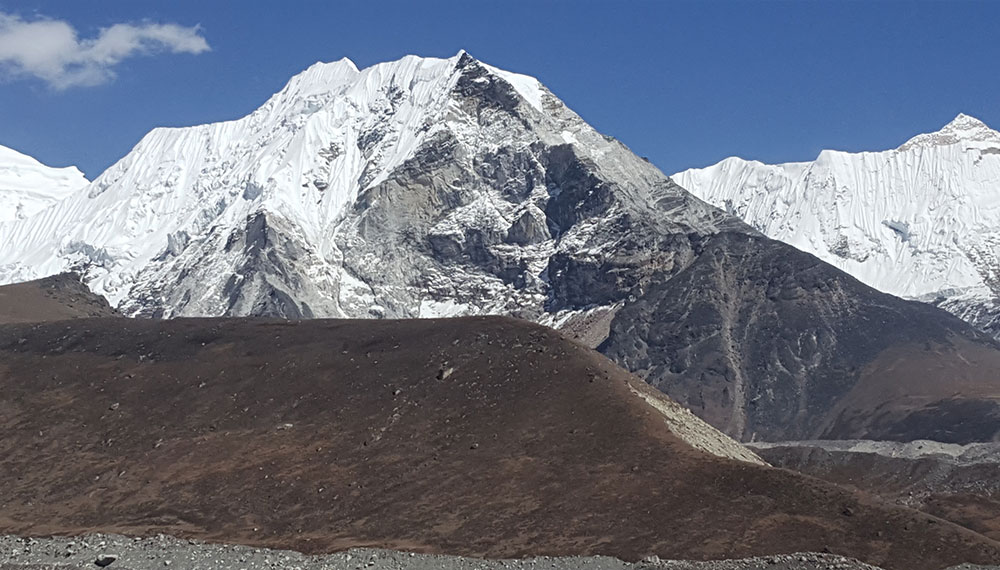 Ascend slowly to a ridge and the hamlet of Duse (4 500m) with western views of Taboche and Cholatse. Continue through kharkas (high pastures) to Duglha (4 620m). Then ascend the Khumbu Glacier’s huge stony terminal moraine (~1 hr). Landmark balanced-stone memorials to lost climbers have been placed along its rim. To the north, border peaks along the Mahalangur Himal include Khumbutse, Lingtren, and Pumori. Everest is hidden by the imposing Nuptse-Lhotse wall.